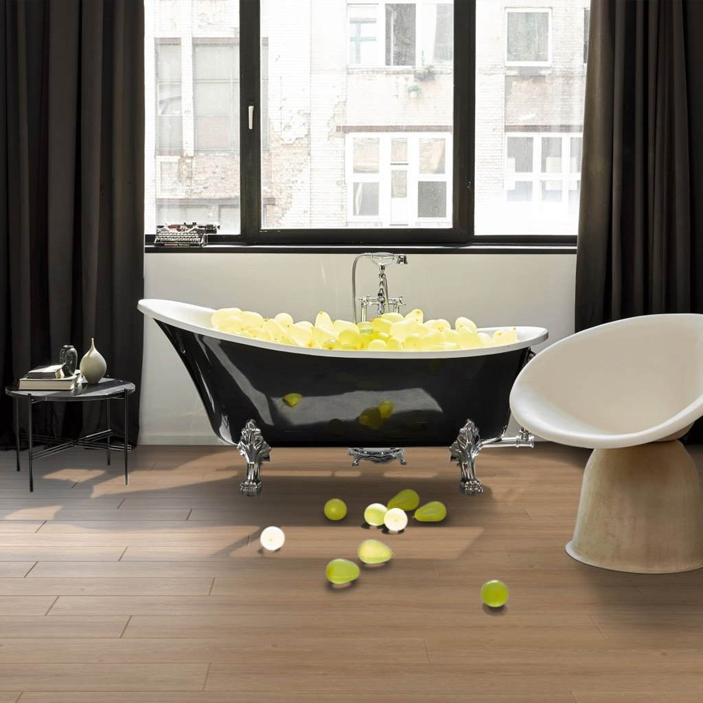 Su tonalidad, en marrón claro, lo convierte en un suelo vinílico que combina muy bien tanto en espacios amplios como en espacios más reducidos, aportando luminosidad y claridad a la estancia. La gama de marrones de la madera de roble proporciona calidez al ambiente y un resultado estético que combina muy bien tanto en estilos modernos como en estilos clásicos. Para lograr contraste con la decoración, escoge el mobiliario y textiles en tonos más oscuros. Los estores y cortinas, si los eliges en tonos claros, blancos y beige, lograrán un efecto de mayor luminosidad.