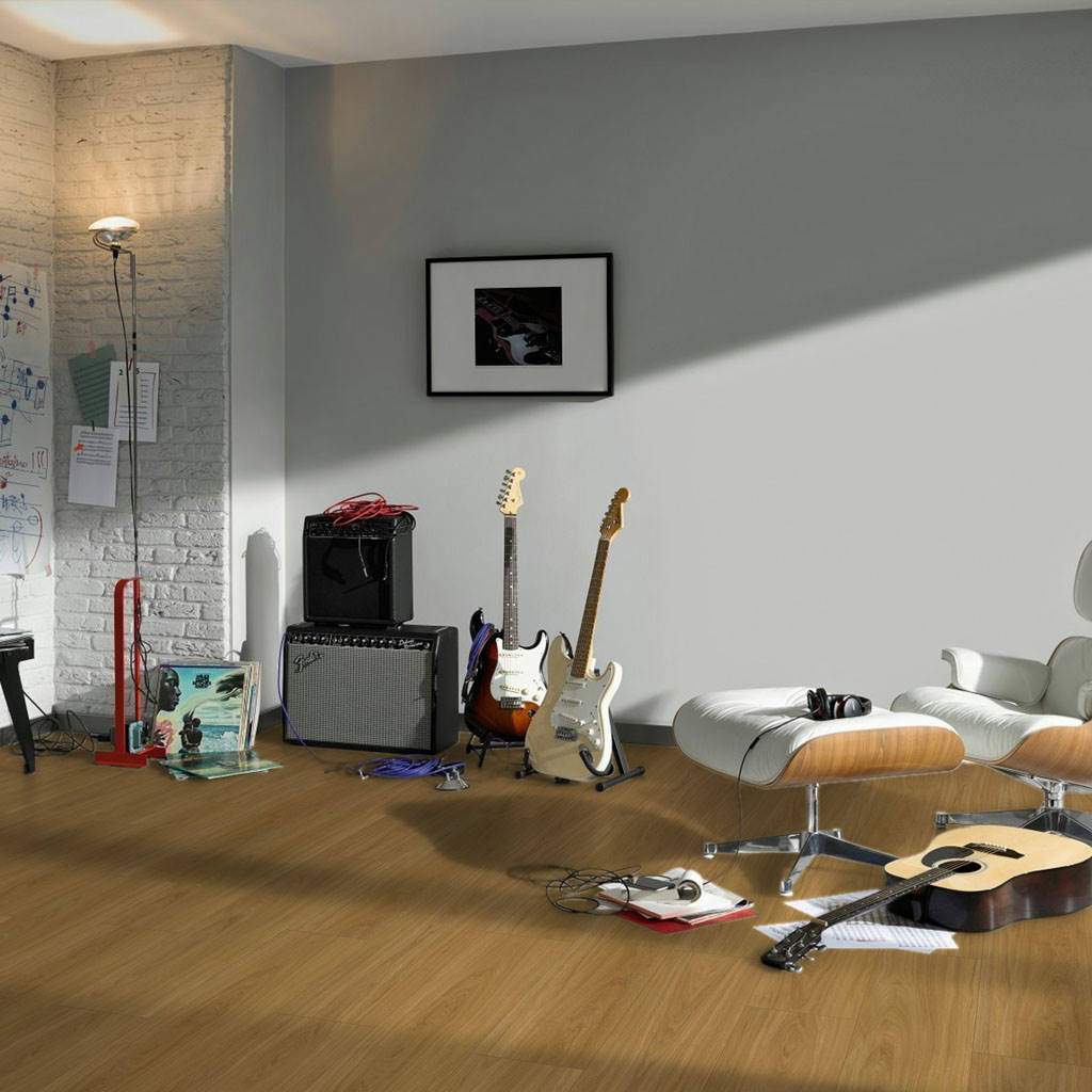 El color marrón en tono caramelo del roble de este suelo de vinilo, en una tonalidad media, lo hace idóneo para espacios más amplios, cuando quieras lograr un ambiente más acogedor y cálido. El atractivo de las vetas y nudos de la madera de roble quedan perfectamente plasmados en este suelo vinílico, con un aire clásico que combina a la perfección con estilos más tradicionales y rústicos. Para conseguir el contrapunto con la decoración, escoge el mobiliario y los textiles en tonos más claros. Así lograrás un mayor contraste y un resultado muy atractivo.