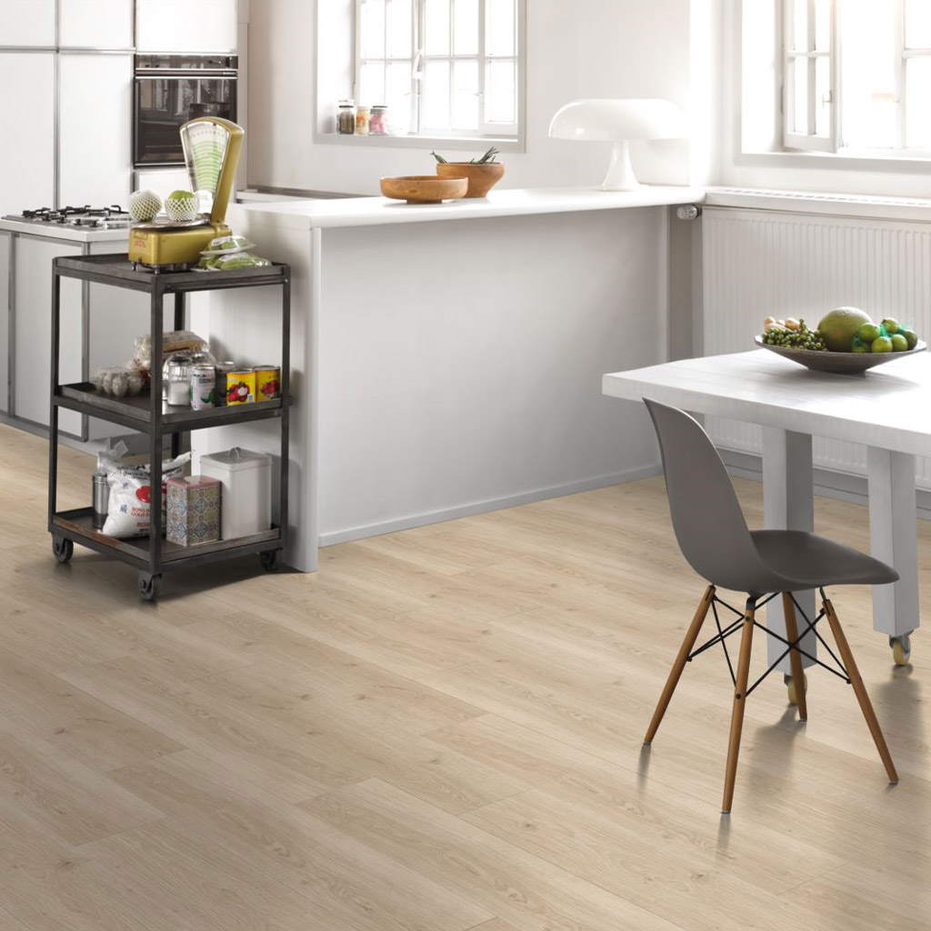 La luminosidad en este laminado, que imita la óptica y textura del roble con un gran realismo en sus vetas, se presenta con un aspecto muy natural y auténtico. La tonalidad clara del roble en color beige combina muy bien en estancias pequeñas donde además no reciban mucha luz natural. Con este laminado, crearemos un espacio con mayor luminosidad y un ambiente más alegre. Además, también crearemos la sensación de que el espacio tiene una mayor amplitud. Este laminado encaja a la perfección en ambientes más clásicos y tradicionales. Puedes combinarlo con elementos decorativos y mobiliario en marrones más oscuros. Así conseguirás una bonita armonía cromática. Escoge los estores y cortinas en tonos claros, para crear un ambiente más alegre y luminoso.